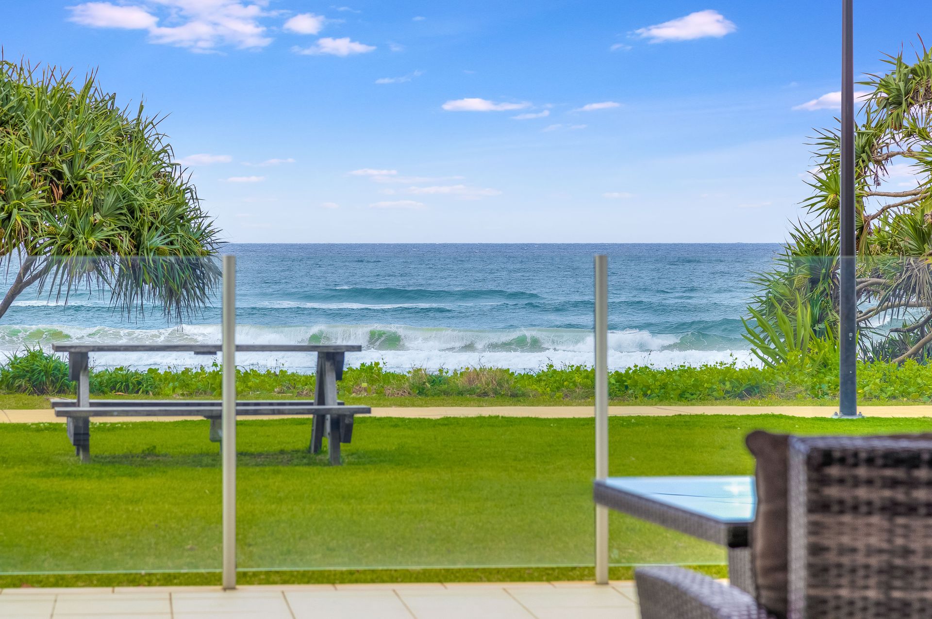Enjoy stunning views across the spacious terrace and manicured lawns out to the Pacific Ocean. With direct beach access, this is perfect for guests looking for a special holiday experience.