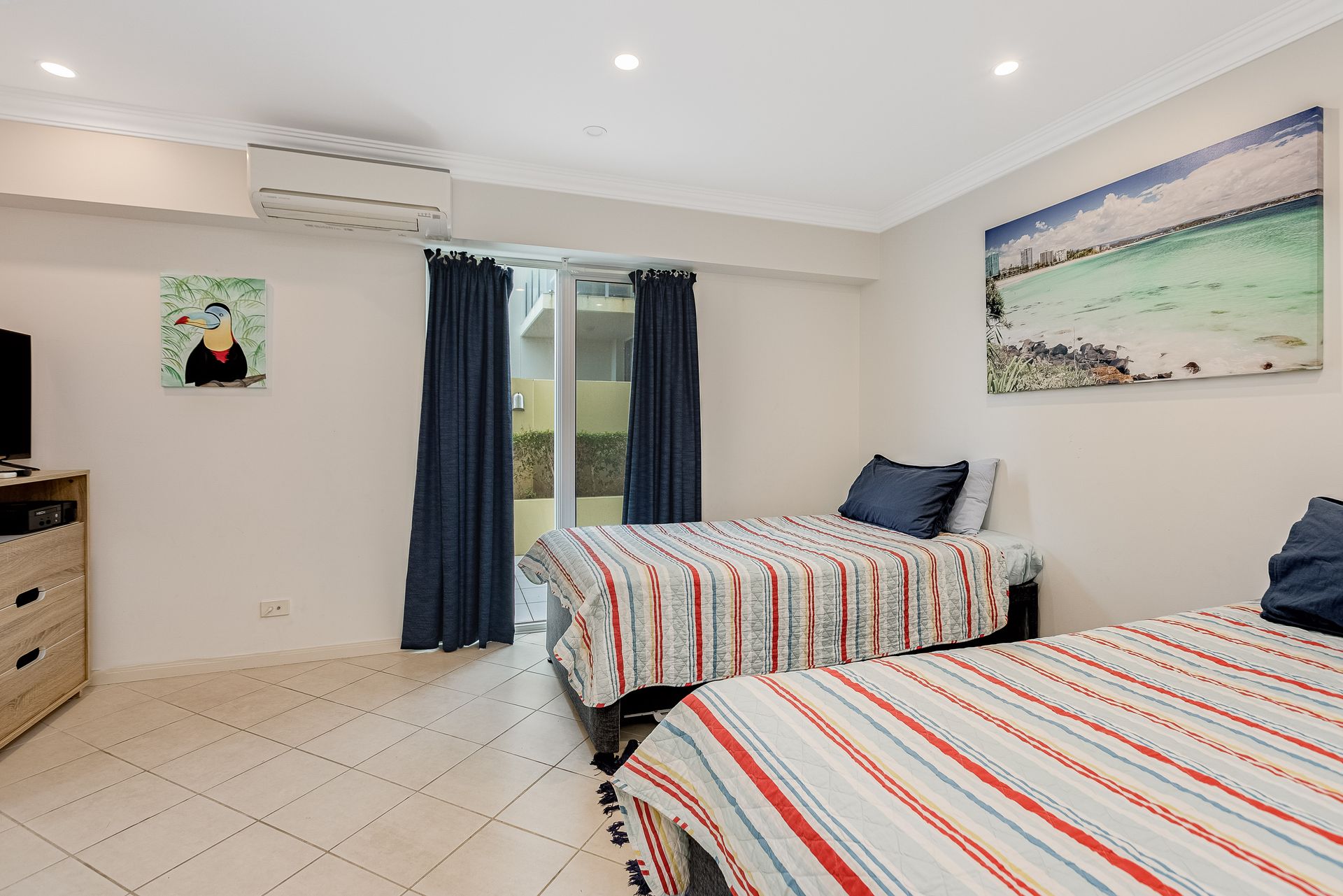 The second bedroom features 2 king single beds and a single trundle bed. The 2 king single beds can be zipped together to form a king, which guests may do on arrival. This bedroom opens up onto a courtyard area and out to the complex pool area.