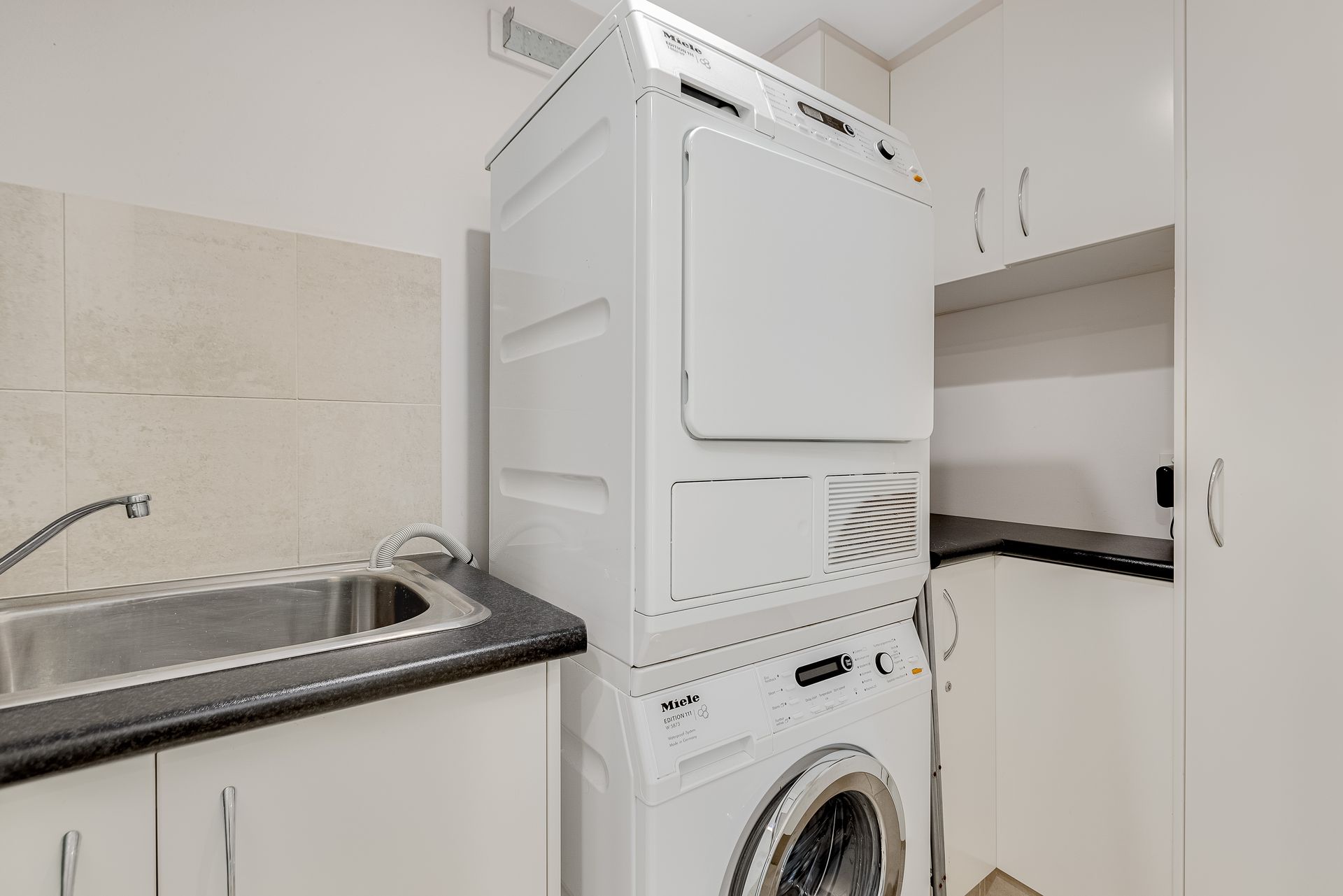 The apartment also offers main bathroom with separate shower and toilet, and laundry with Miele washing machine and dryer.