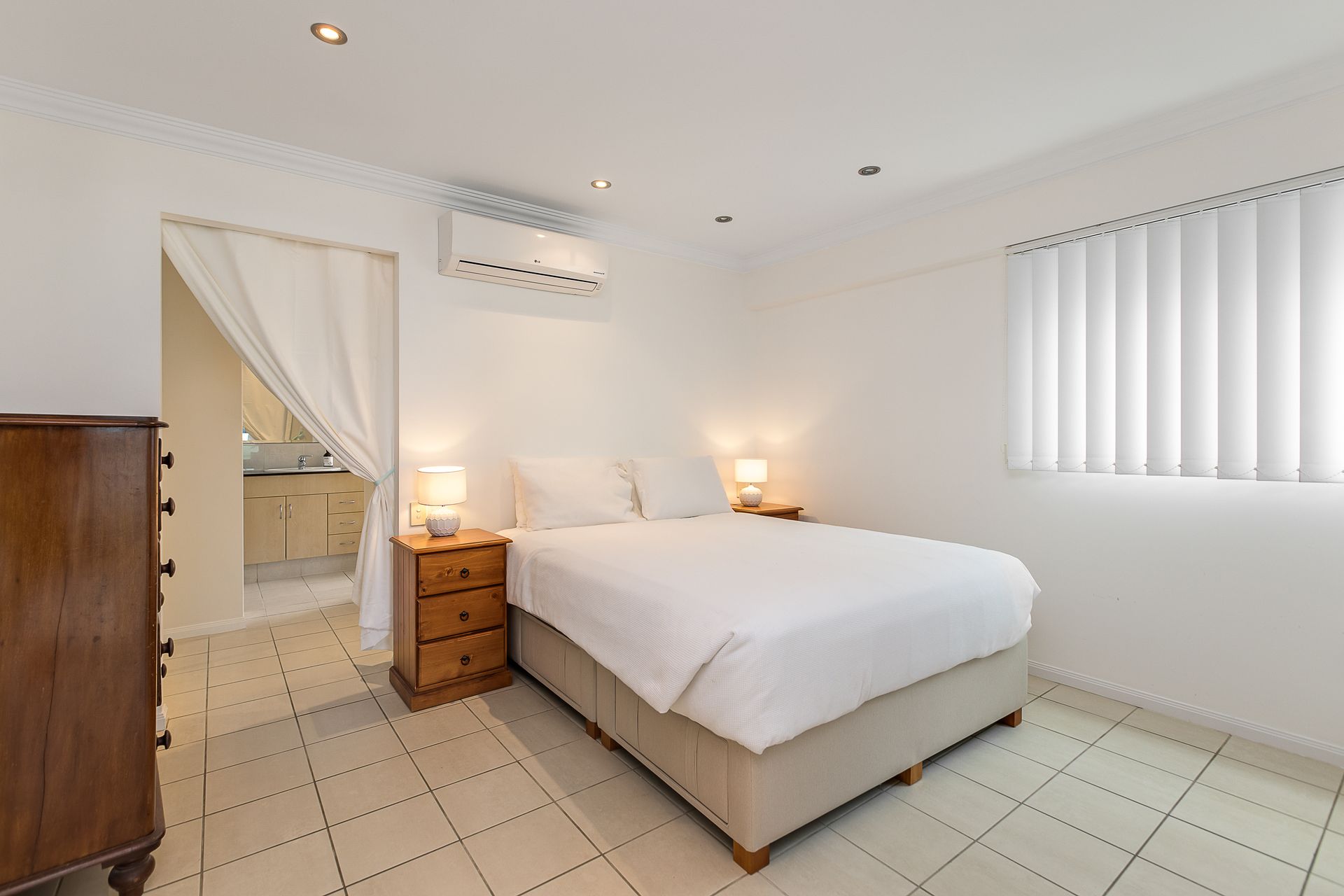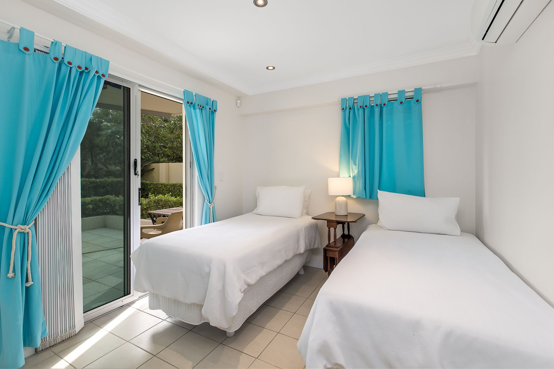The second bedroom features 2 single beds (one slightly smaller than standard). This bedroom opens up onto lovely manicured gardens and out to the complex pool area.