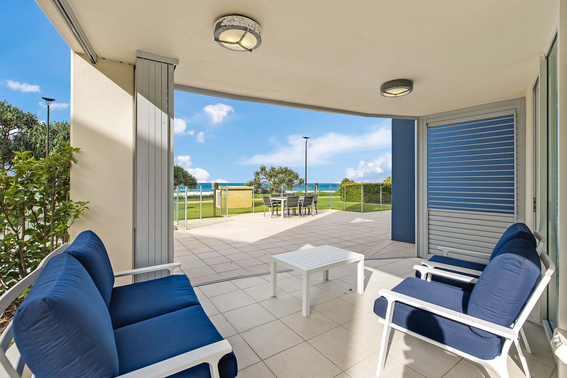 Aqua Solai 2 is located on the ground floor with a very spacious and fenced terrace patio. The covered alfreco dining and sitting area can be closed off with shutters, ensuring privacy and year round comfort. (Note that the open air patio and dining table furthest from the apartment is common area).