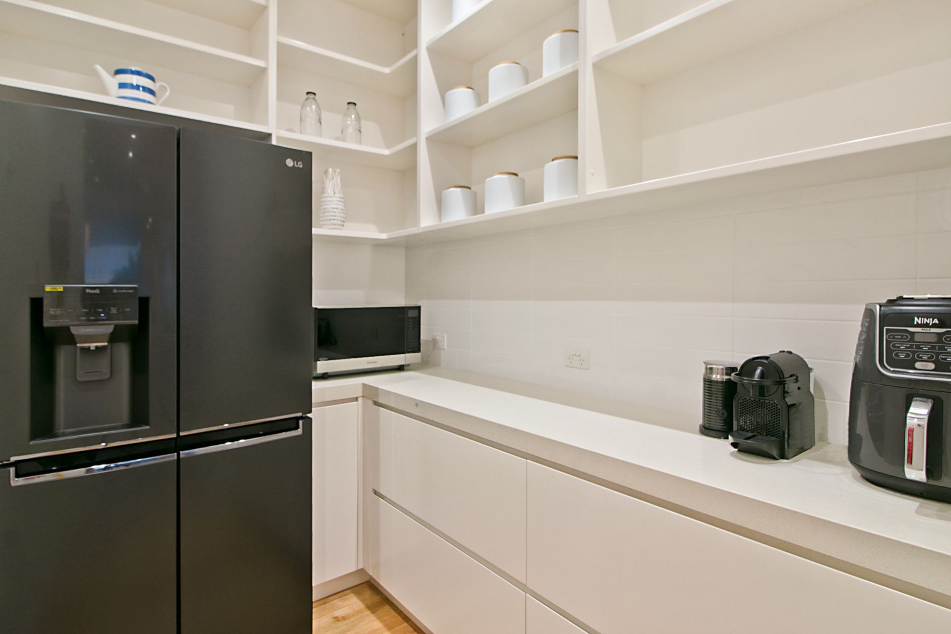 - Gourmet kitchen with butler’s pantry and European appliances including wine fridge, two integrated bar fridges,