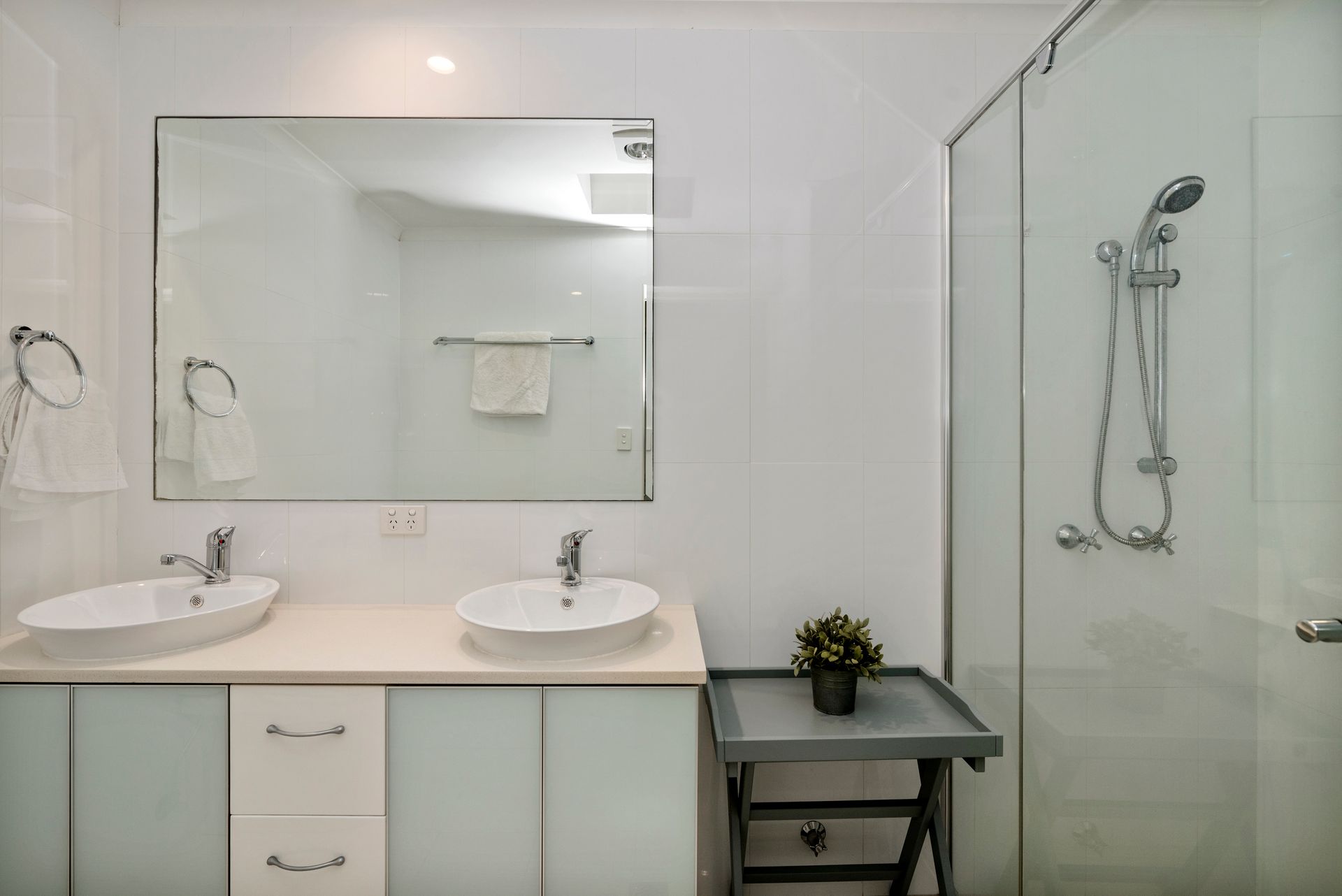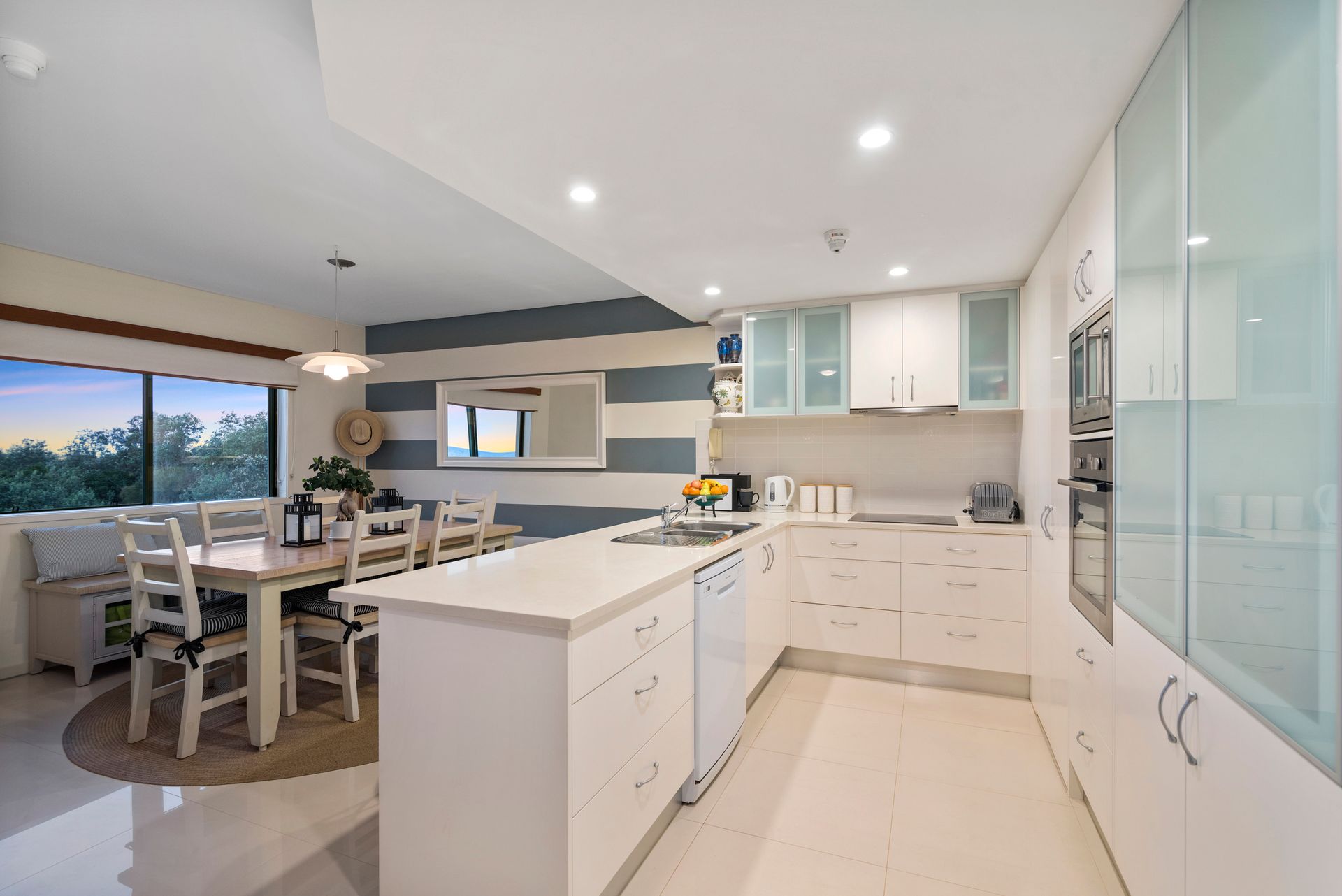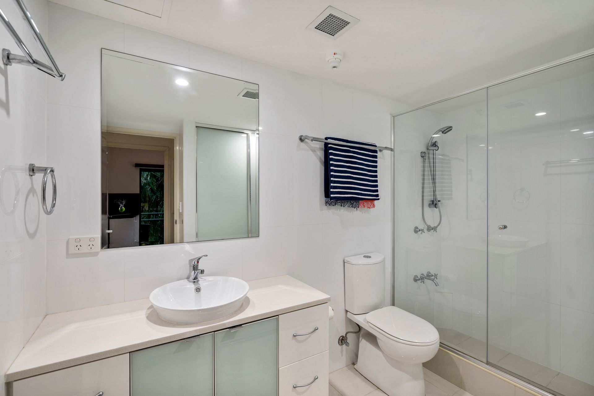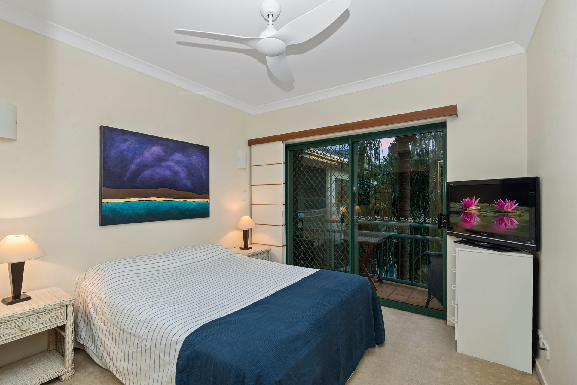 There are two bedrooms downstairs, including one with a queen bed plus balcony overlooking the tropical gardens and pool area, and second bedroom with two single beds. Both rooms have ceiling fans and built in wardrobes.
