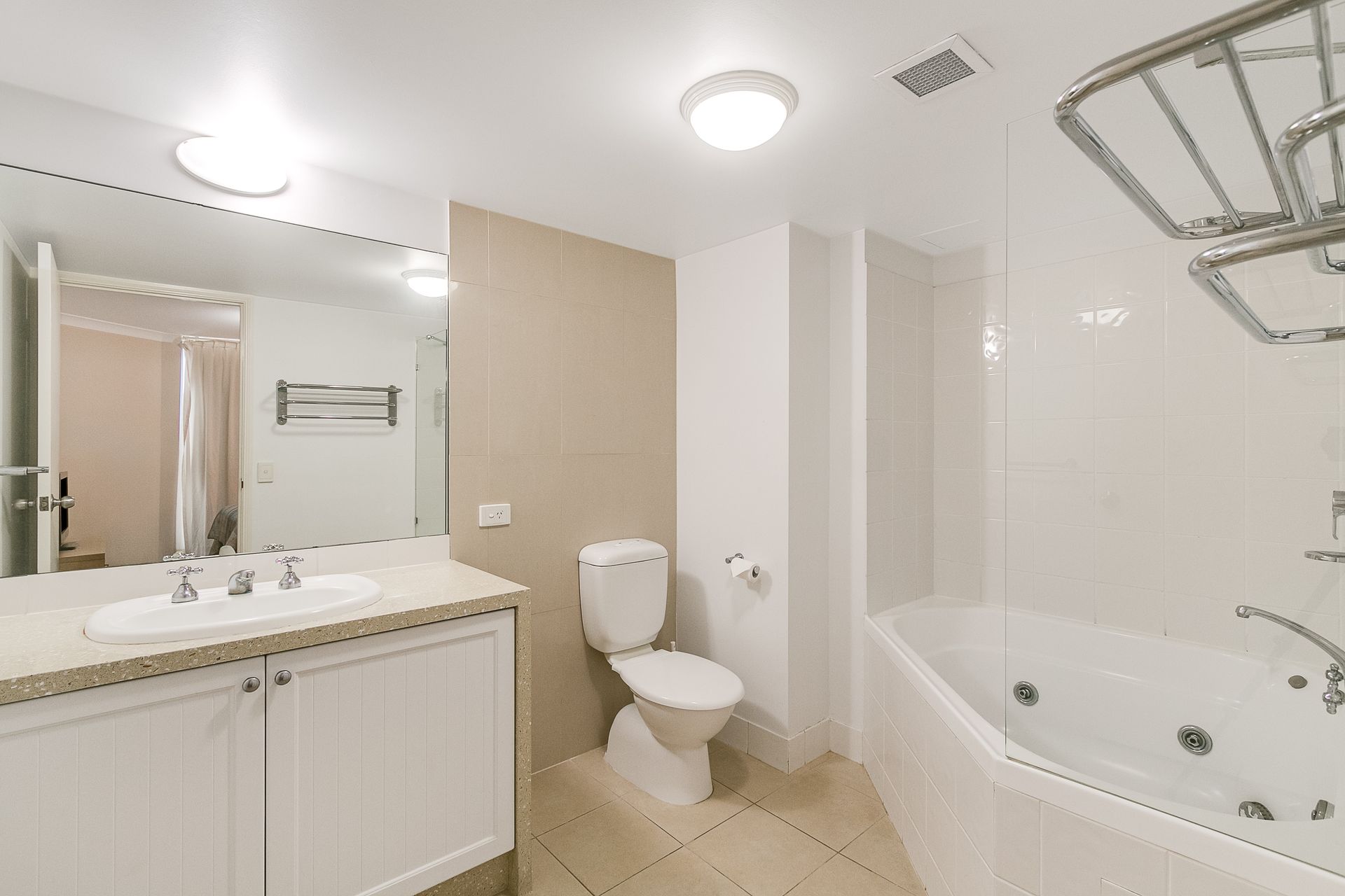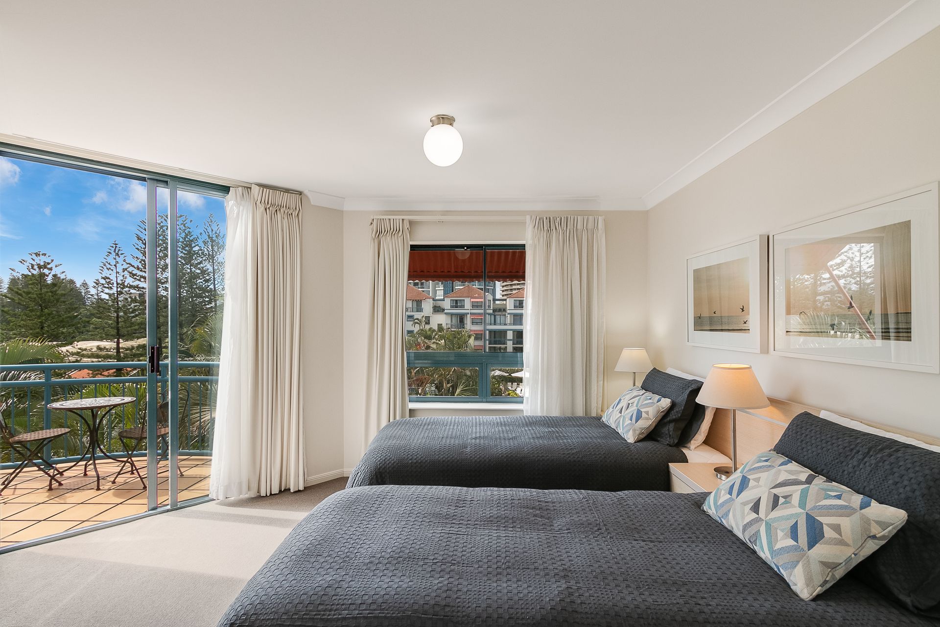 The entry level features two spacious bedrooms, master with queen bed and ensuite with corner spa bath and shower. The second bedroom offers 2 king single beds and both rooms have access to the balcony overlooking the pool area and beach.