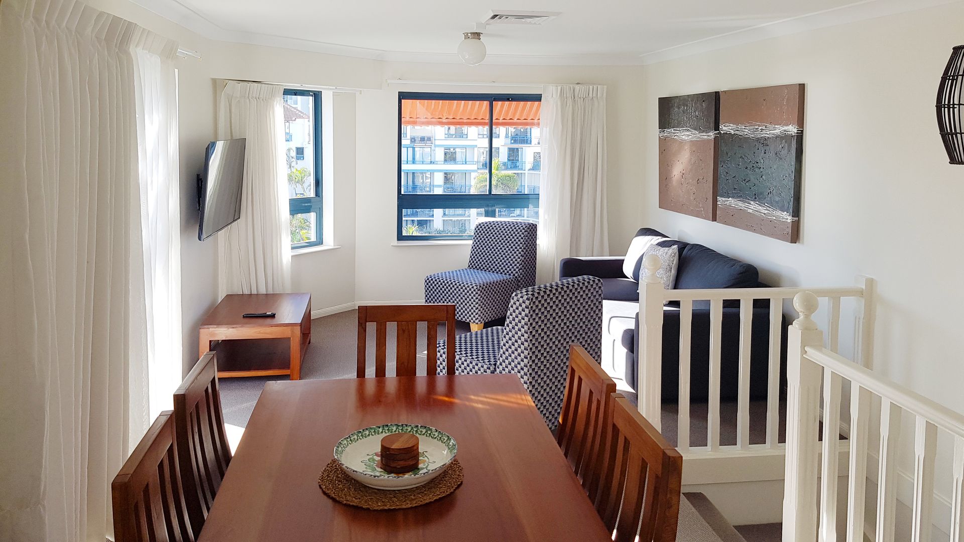 The upper level offers open plan living with a modern, fully equipped kitchen including dishwasher and dining area seating 6 plus a powder room. The comfortable loungeroom features a double sofa bed (perfect for kids) and smart TV.