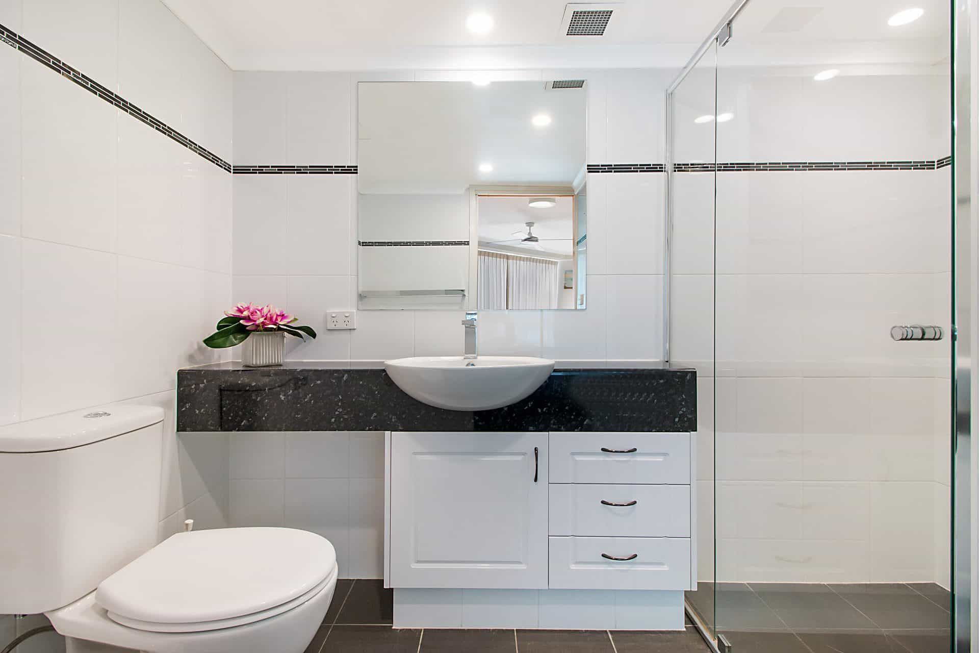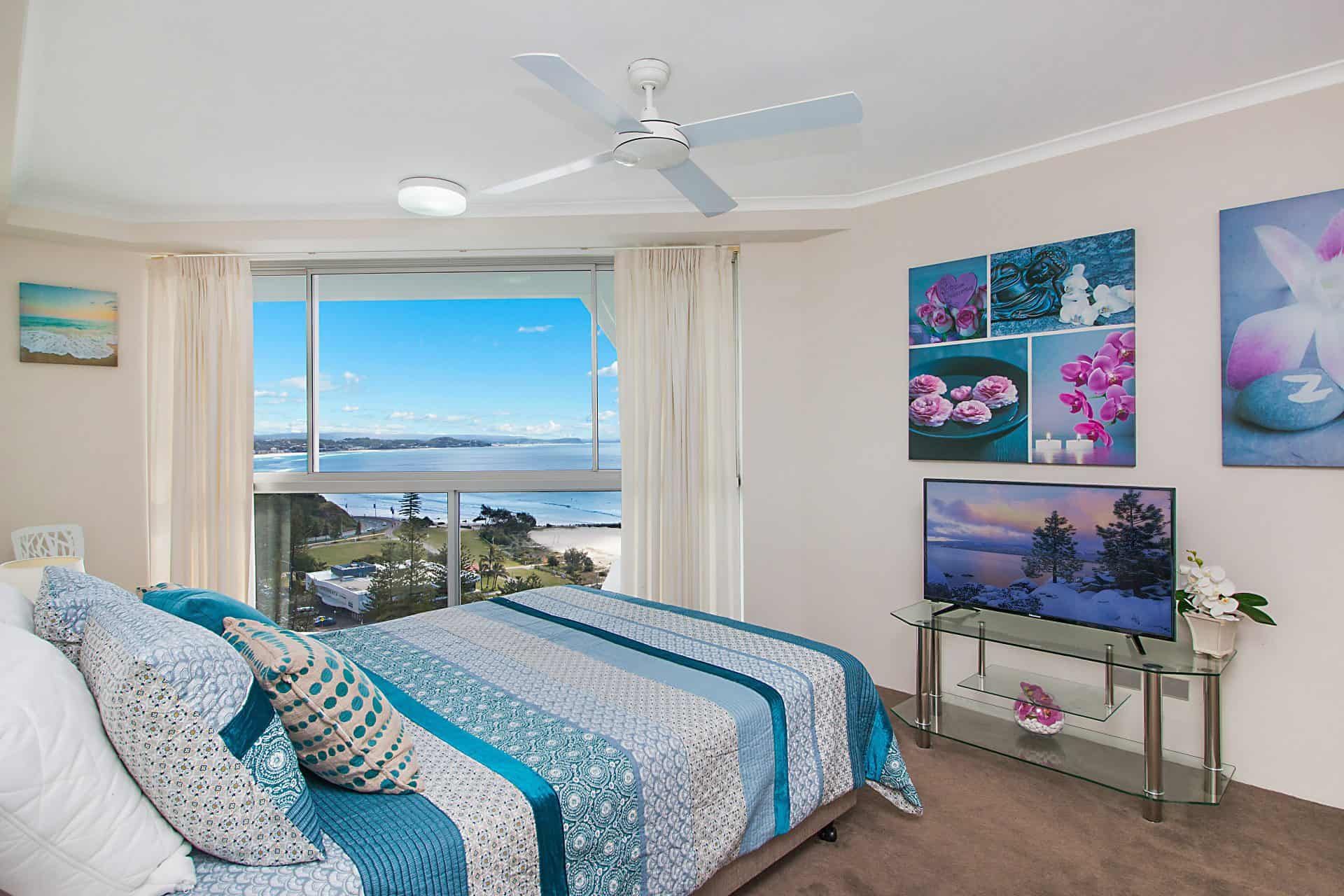 The unit offers 2 bedrooms and 2 bathrooms (master with ensuite). The master bedroom offers queen sized bed, ensuite with walk in shower, and wall mounted flat screen TV. The second bedroom offers 2 king single beds and both bedrooms have ceiling fans for year-round comfort. Both bedrooms also offer stunning views and refreshing coastal breezes.