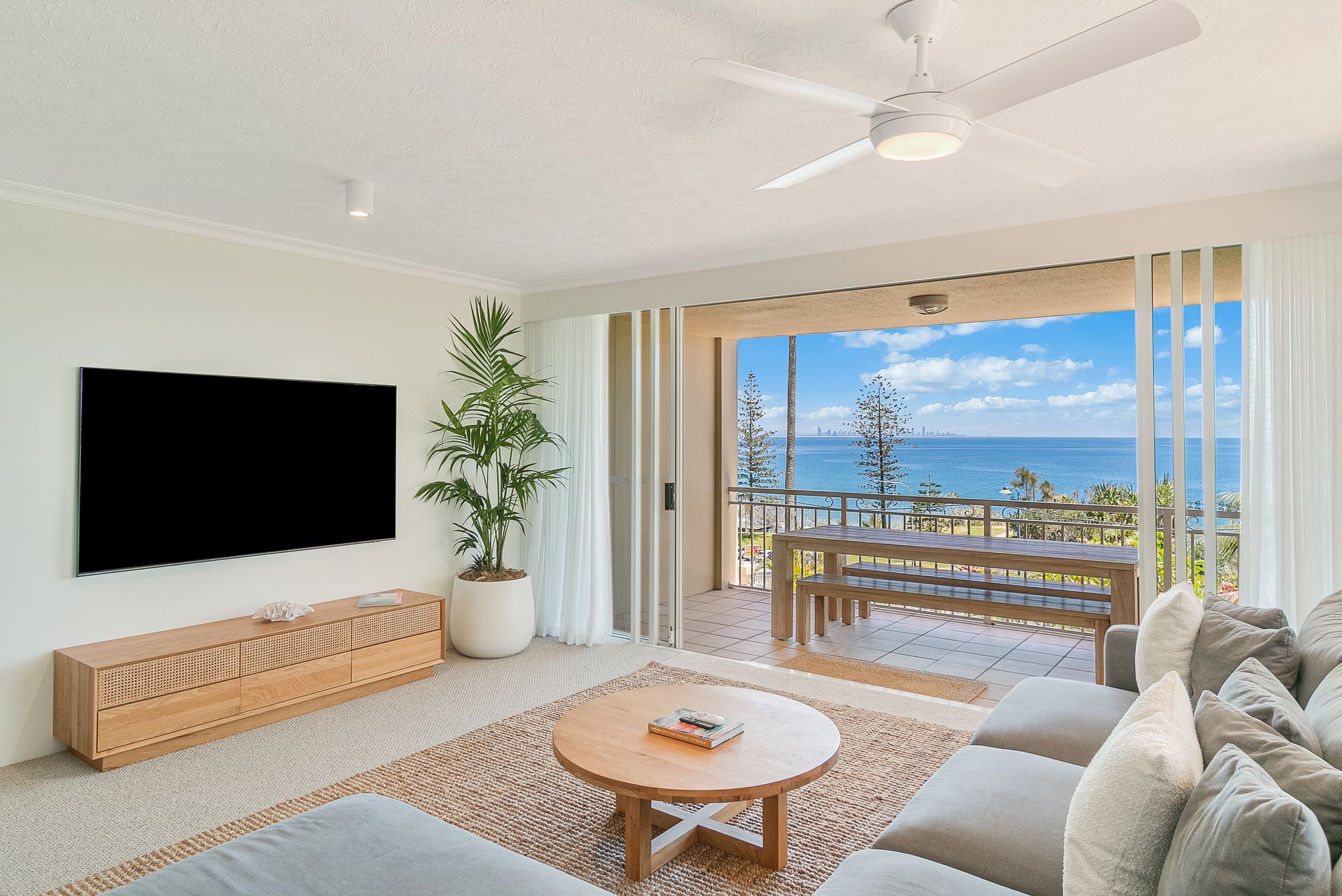 Step out onto the expansive covered balcony, offering breathtaking ocean views and refreshing sea breezes. This is the perfect spot to watch the surfers in the lineup at Snapper, whale-watch in winter, or admire the Surfers Paradise skyline as it lights up at night.