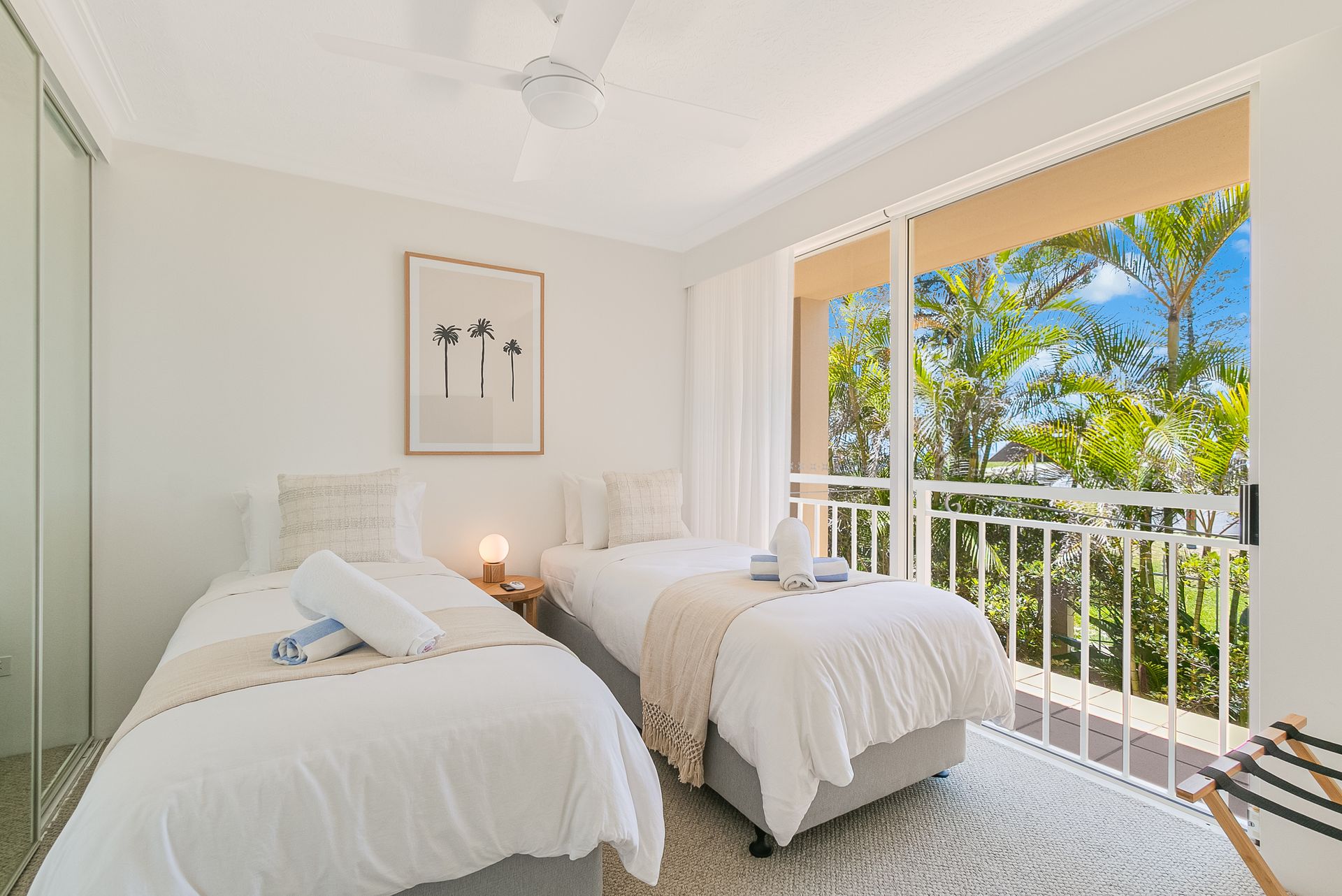 The second bedroom includes two long single beds, a smart TV, built-in wardrobes and sliding door to offer ocean views and breezes.