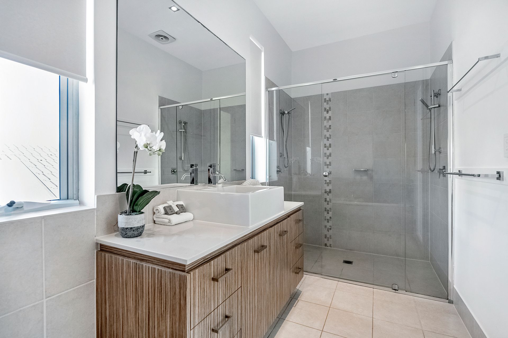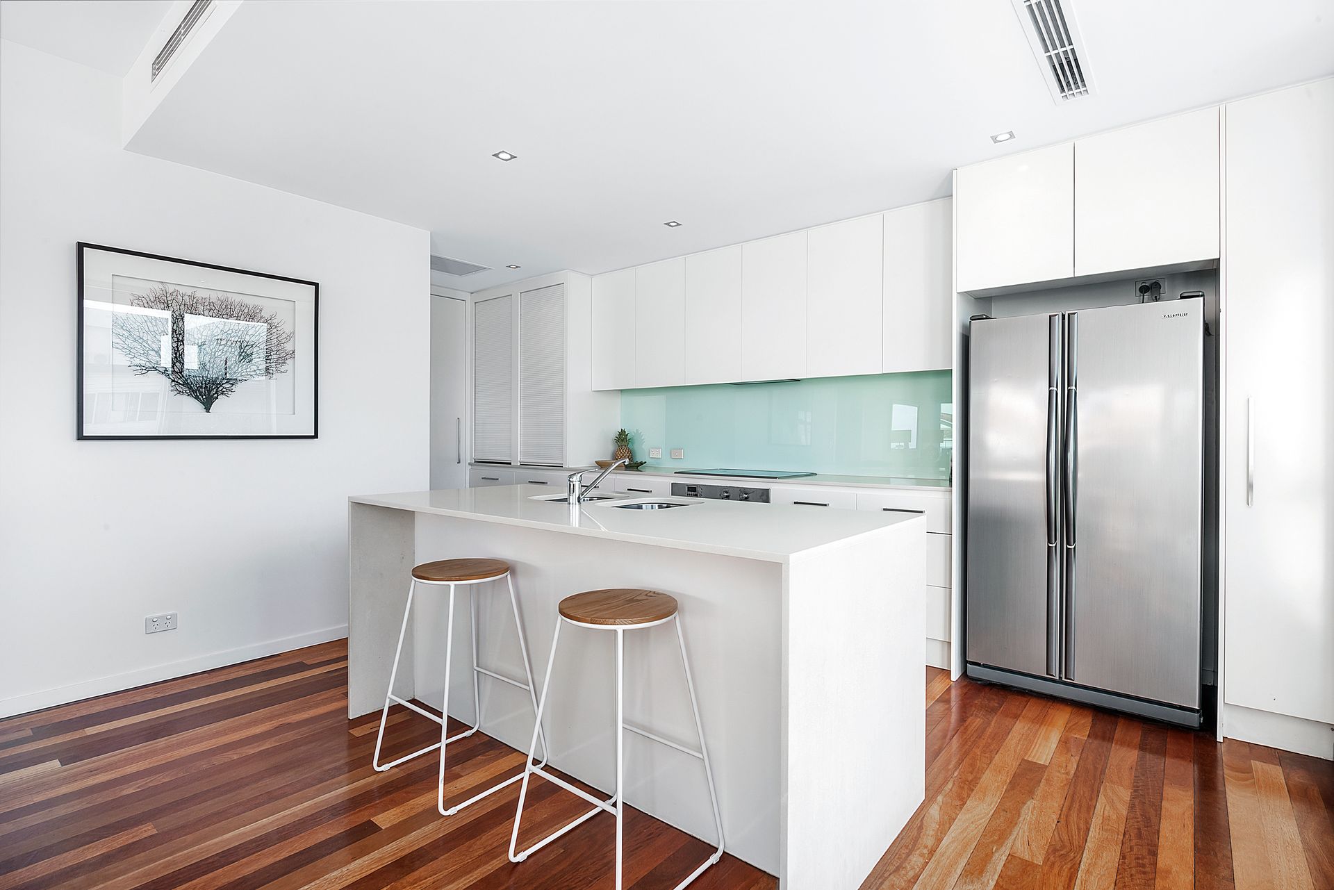 The sleek and modern kitchen features walk in pantry, high quality appliances including dishwasher and coffee machine and breakfast bench.