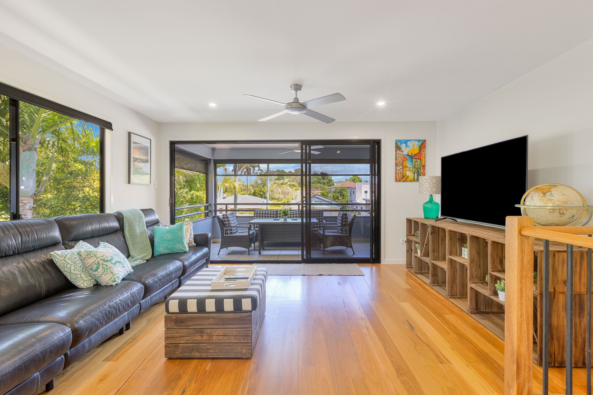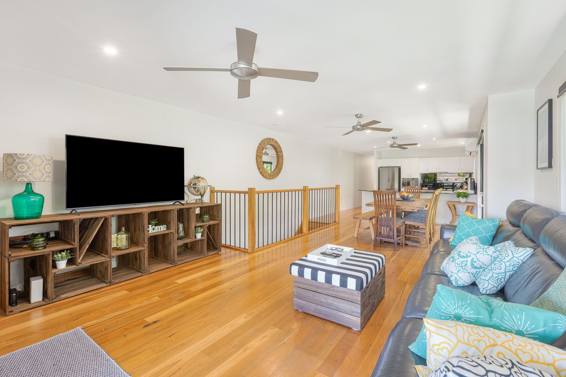 - Open plan living area featuring polished floorboards, comfortable furnishings and smart TV with Wi-Fi