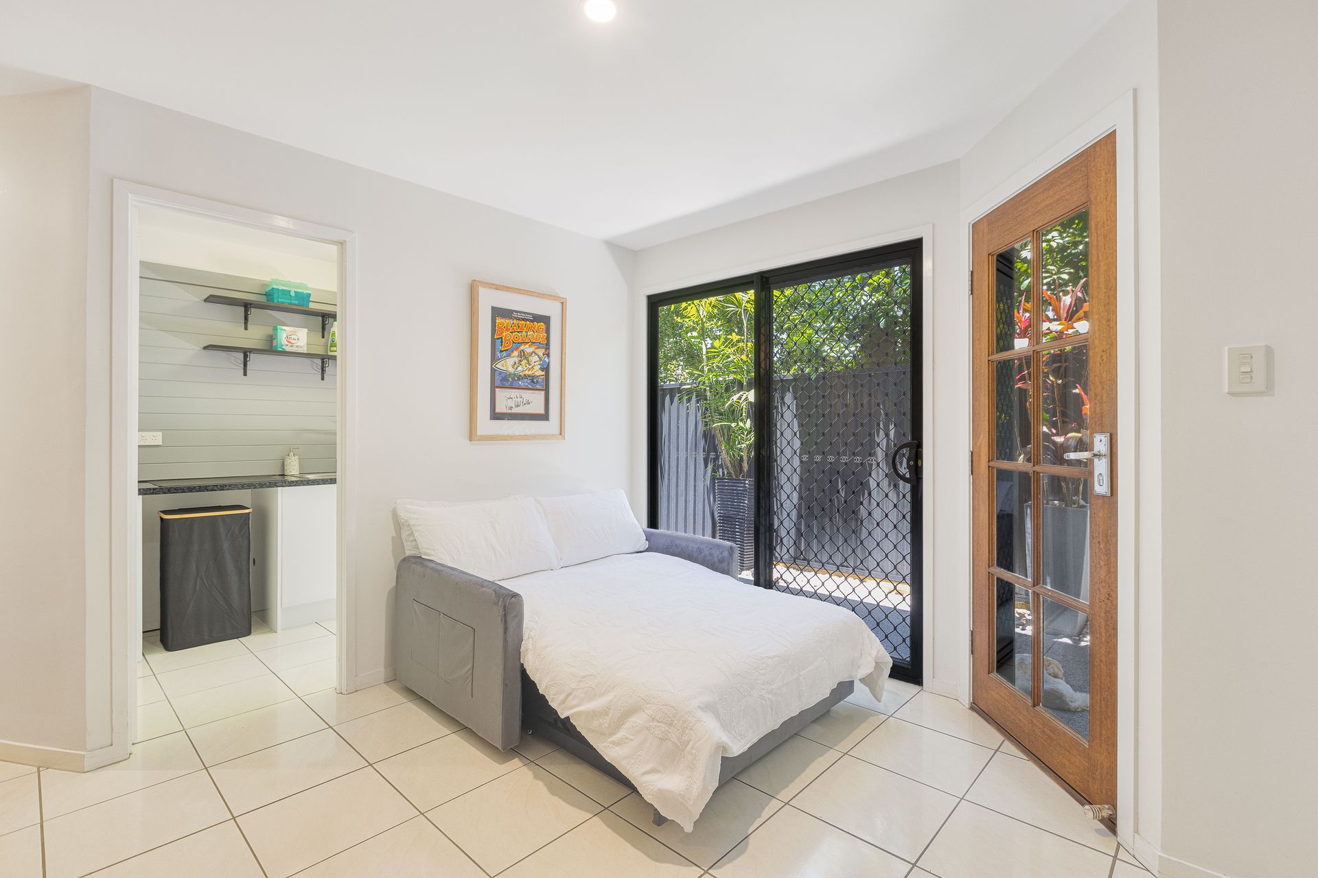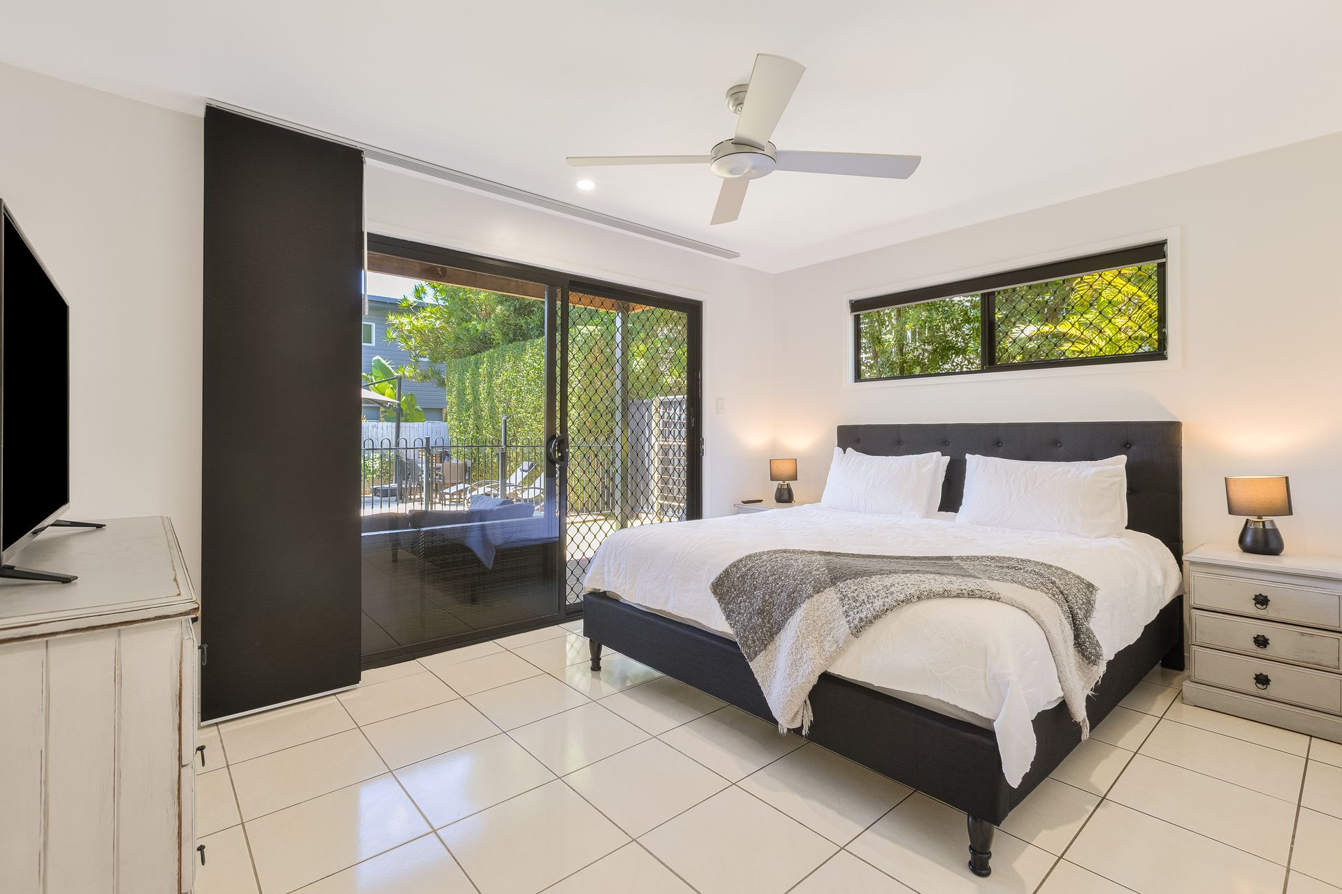 - Bedroom with 1 x king bed, smart TV and access out to the backyard and pool area