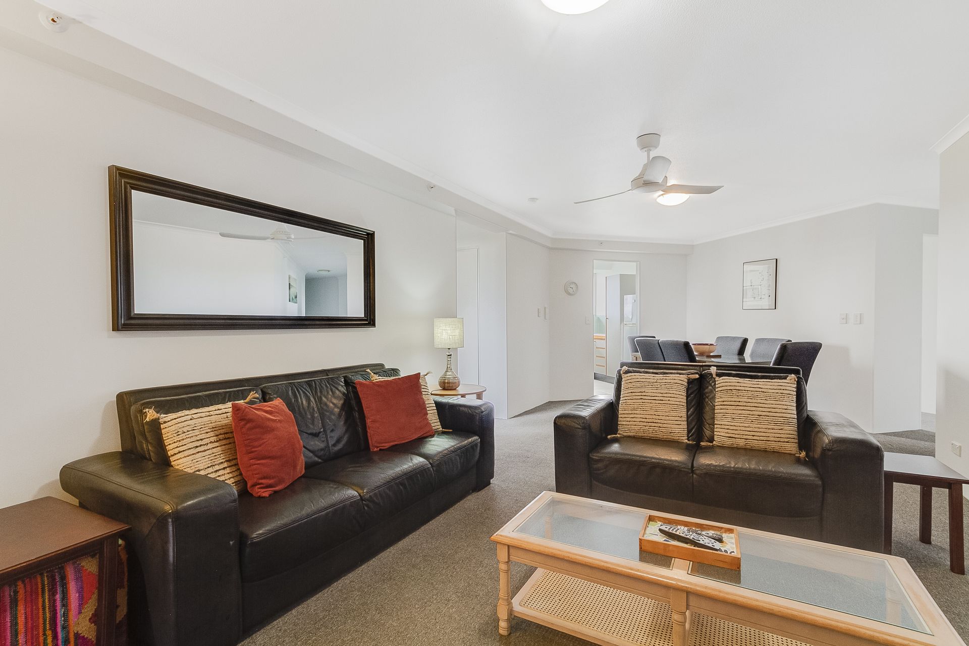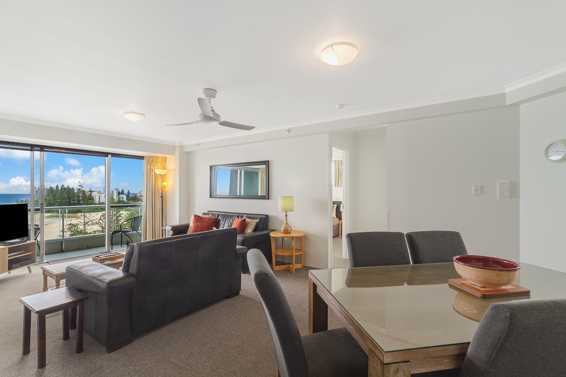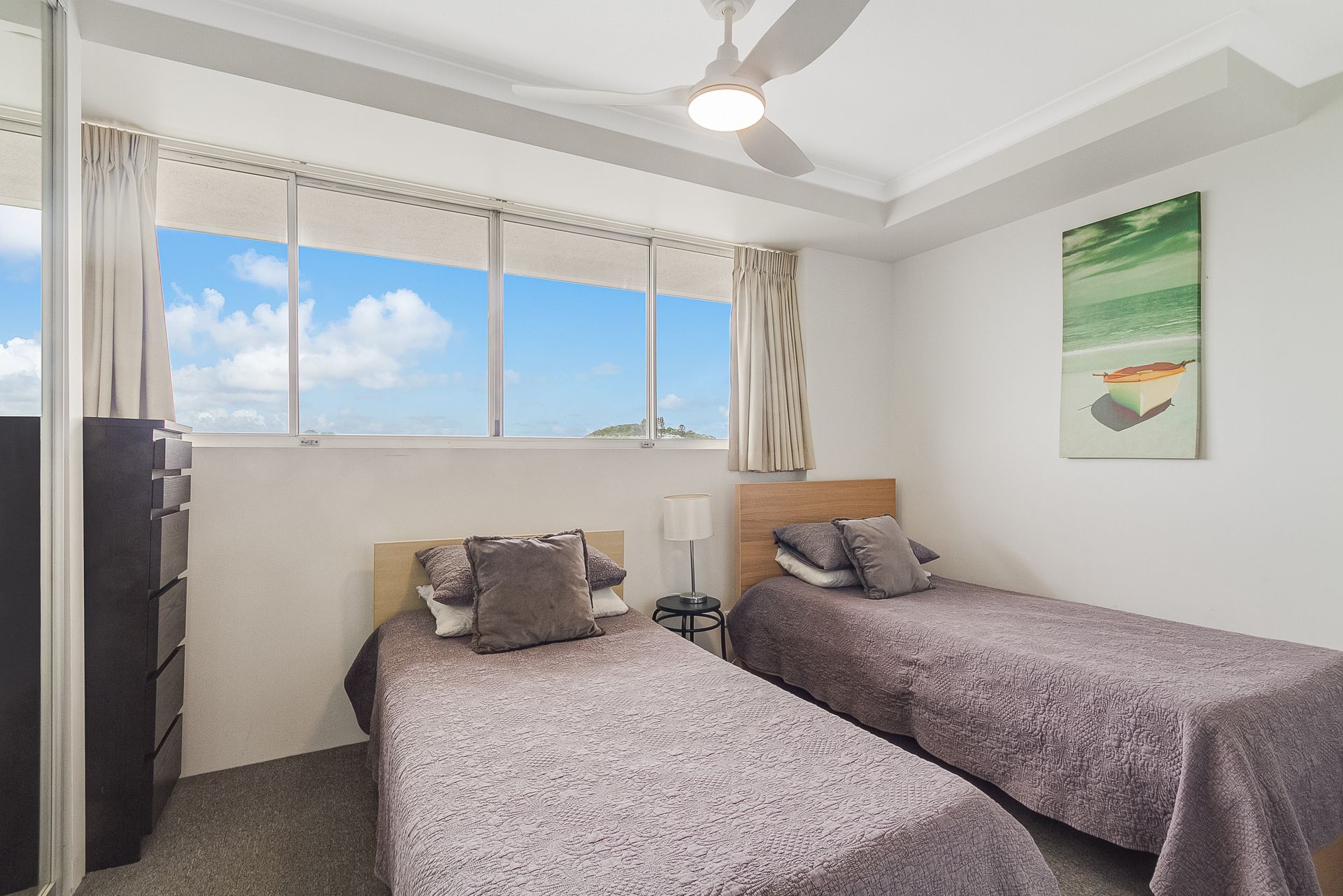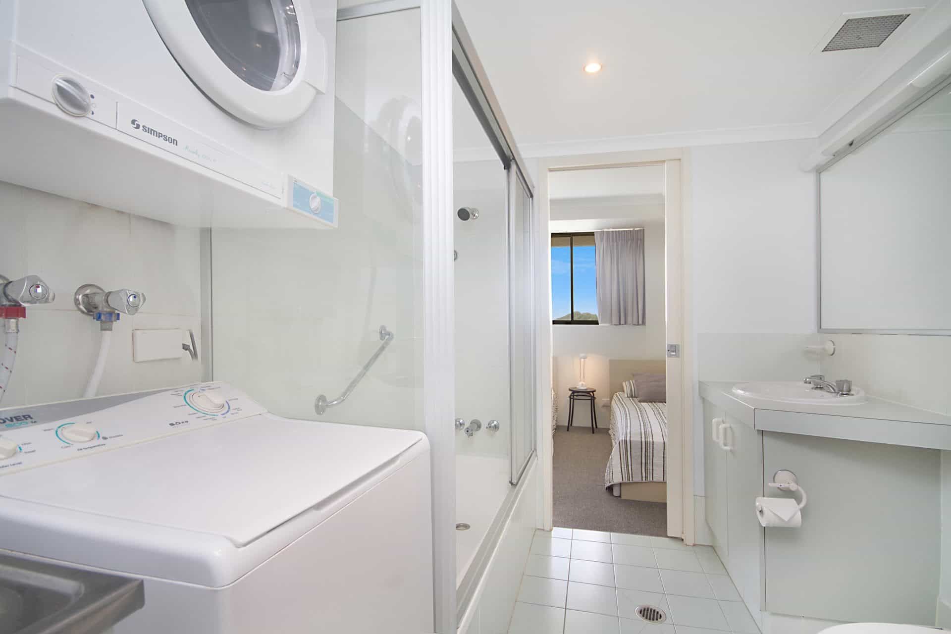 The apartment offers 2 bedrooms- master bedroom with queen bed, ensuite and stunning ocean views. The second room offers 2 single beds, access to the main bathroom/ laundry and views over the hinterland. Both rooms have ceiling fans for year round comfort.