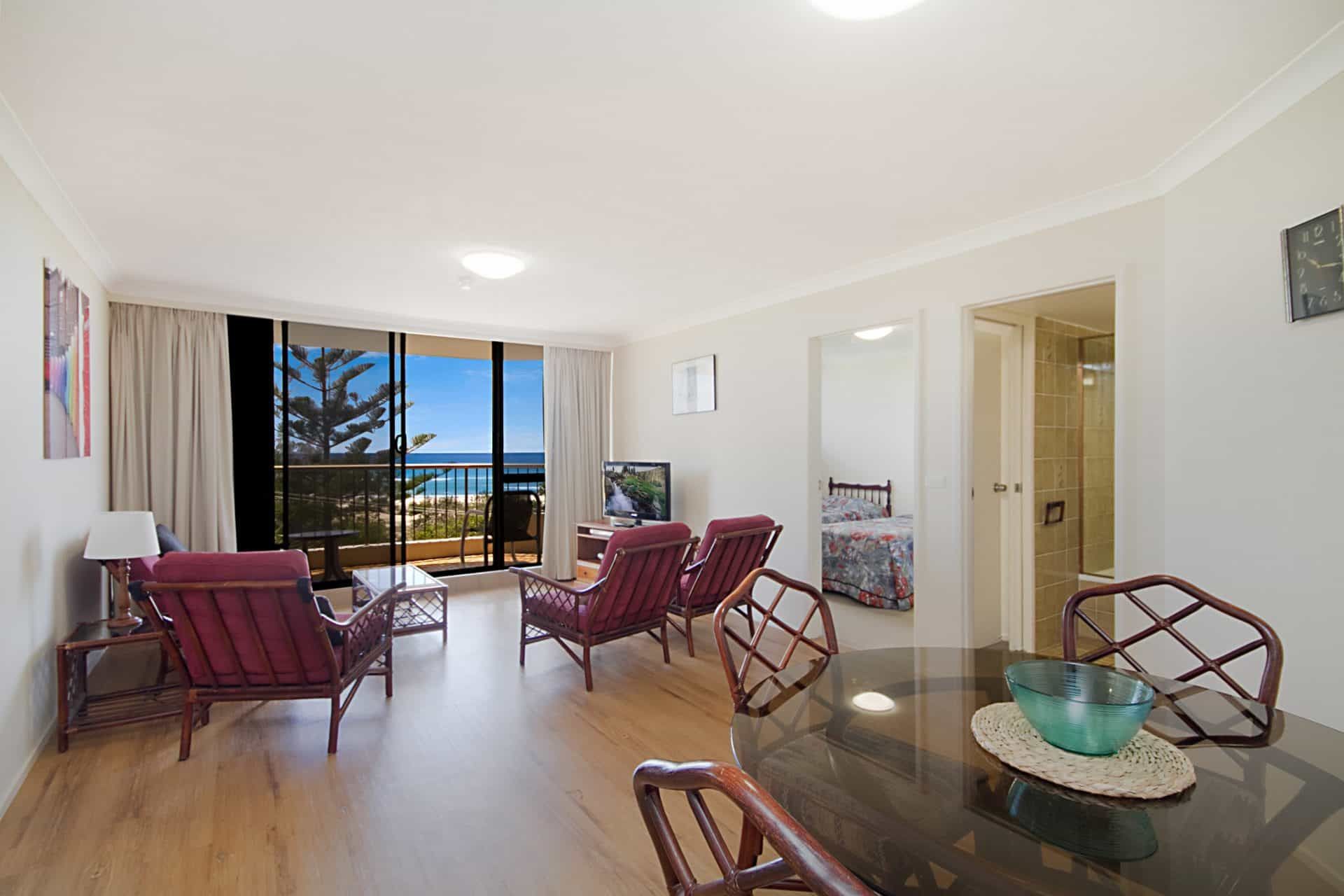 Lovely balcony views from this 3rd-floor unit. As other reviewers have stated, this unit is dated but it was very clean and really a great place to stay. The pool is excellent and there is even a tennis court, if you can drag yourself away from the balcony view. We really liked it for a short stay. When we come to Kirra-Coolangatta we always stay just a little to the north (like here at Bilinga) to enjoy the quieter setting and make ourselves exercise (walk) to get to the patrolled beaches.