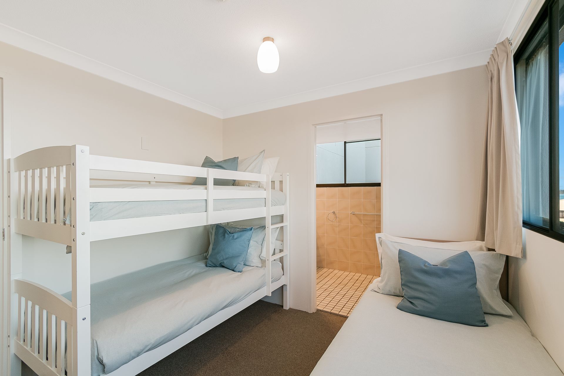 The master bedroom has one queen bed, ensuite and juliette balcony. The second bedroom has a single bed, plus a set of single bunks and ensuite with shower over bath.
