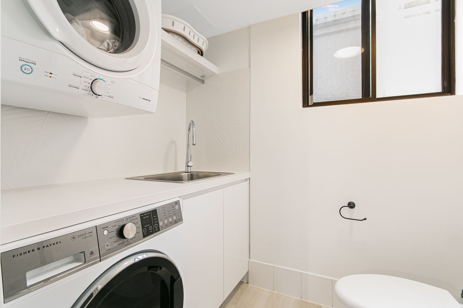 The main bathroom has a shower over bath plus separate toilet, and there is a washing machine and dryer for guests to use.