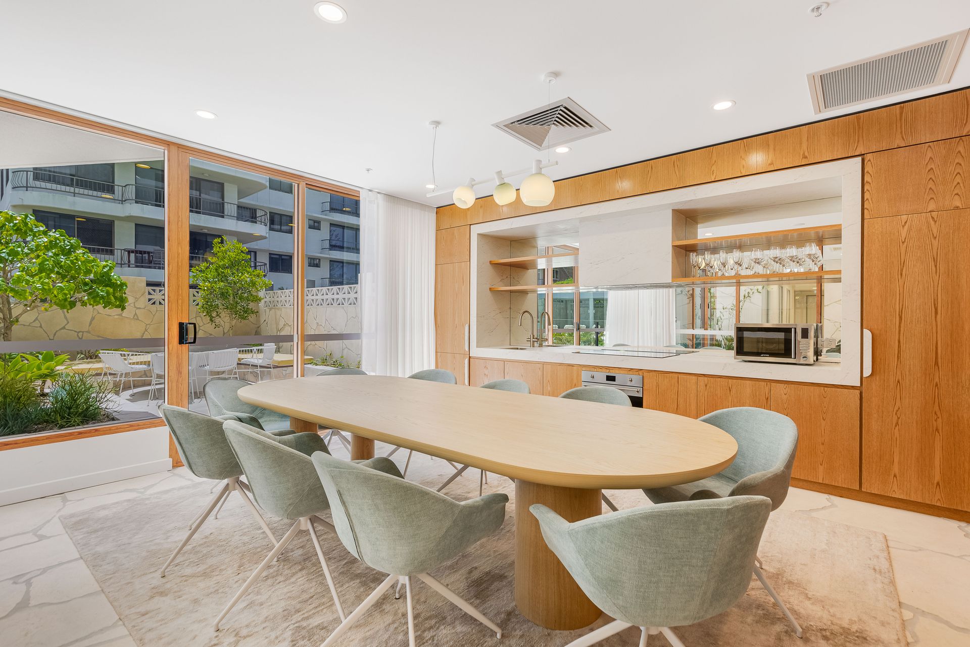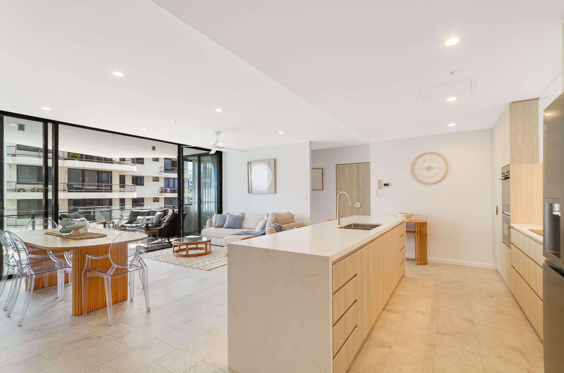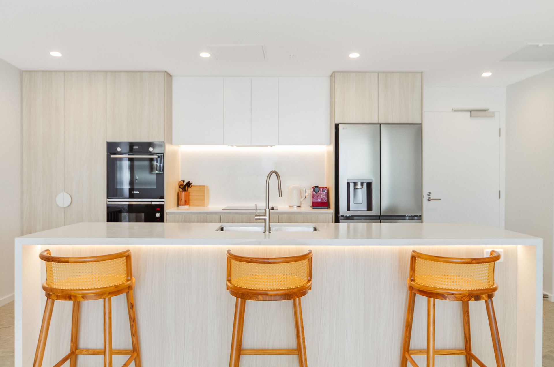 The fully equipped kitchen is designed for entertaining with a stone island breakfast bar and high-end appliances, including fridge/freezer with ice and water dispenser, integrated dishwasher and coffee pod machine.