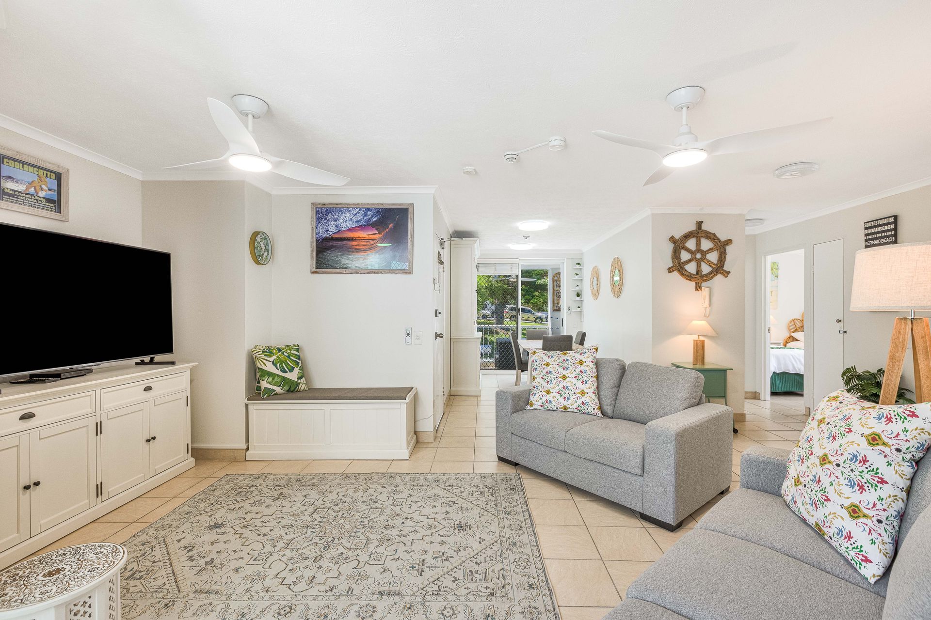 The Bay Apartment 15 features a cool, open-plan living area with reverse-cycle air-conditioning, two ceiling fans, comfortable furnishings, and a smart TV with unlimited Wi-Fi. A separate dining area seats six, and there are two private balconies, one of which overlooks the swimming pool and gardens.