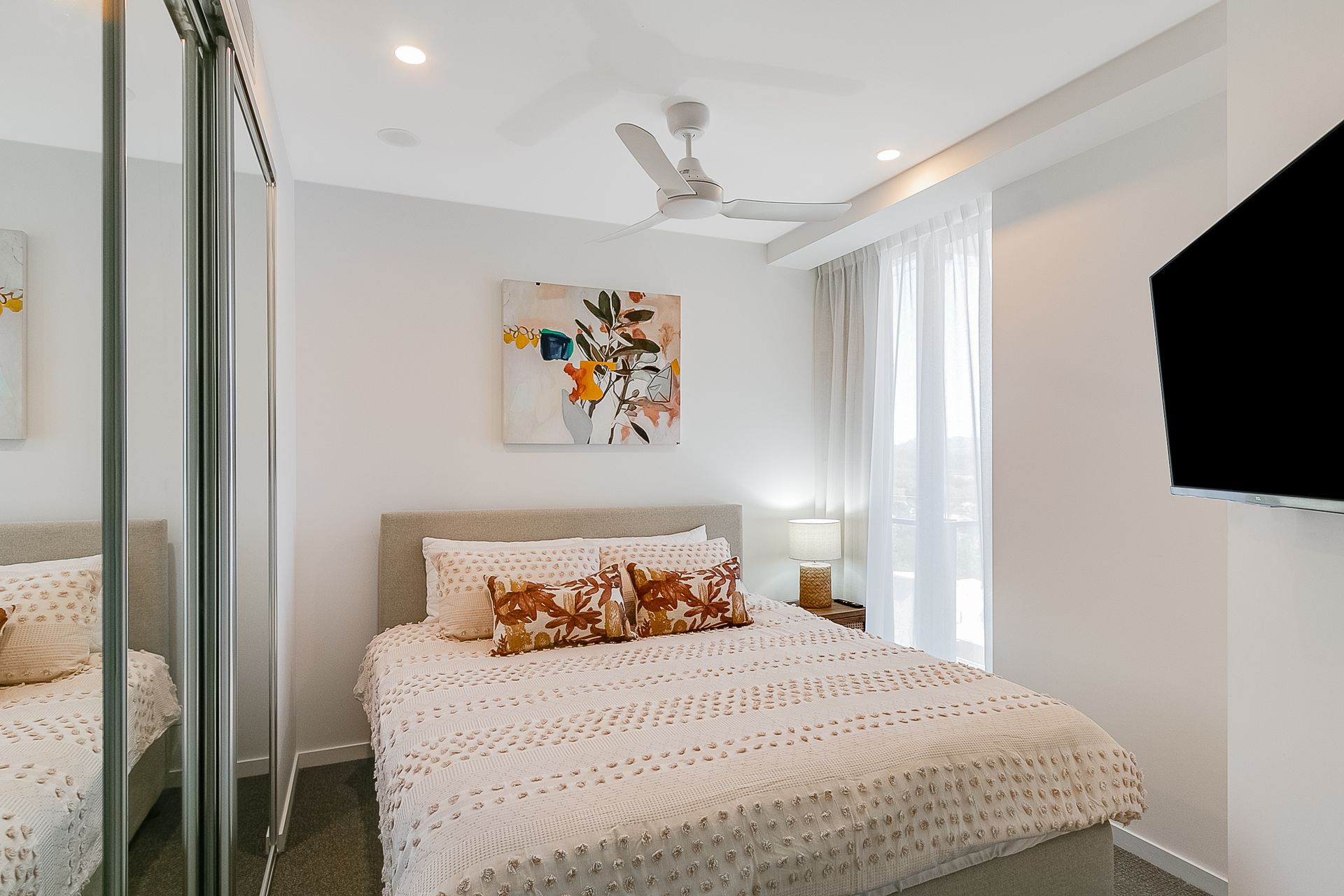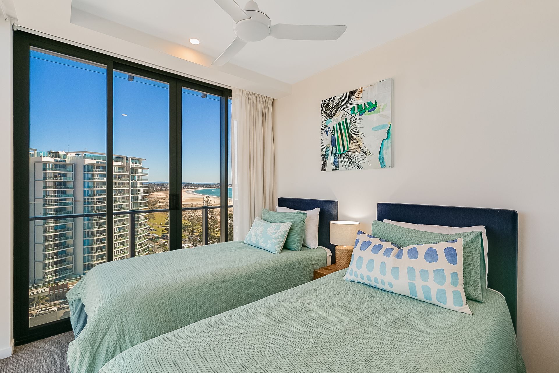 The second bedroom has 2 king single beds and both rooms have access to the side balcony which offers stunning views of the sun setting over the Gold Coast Hinterland.