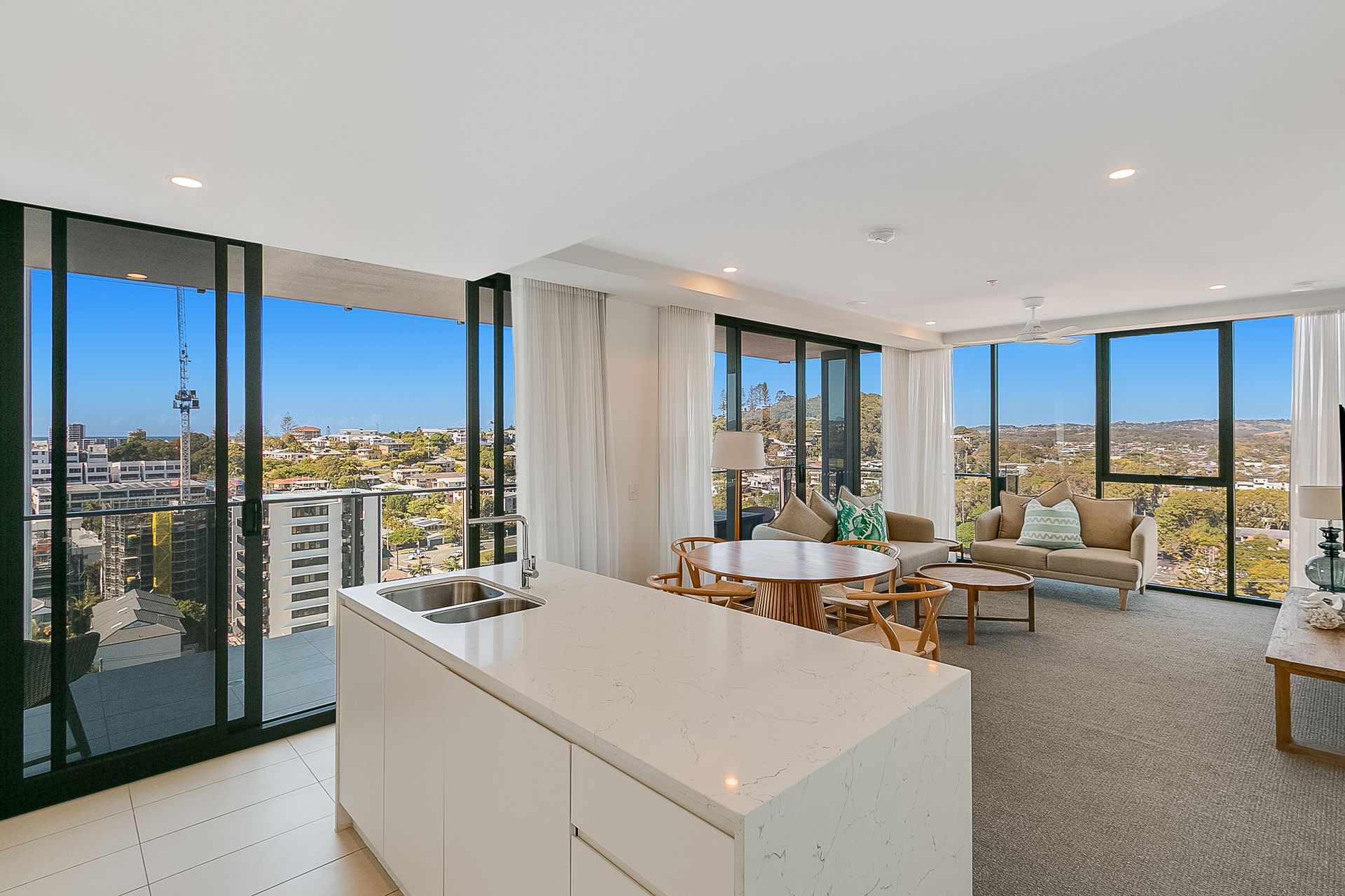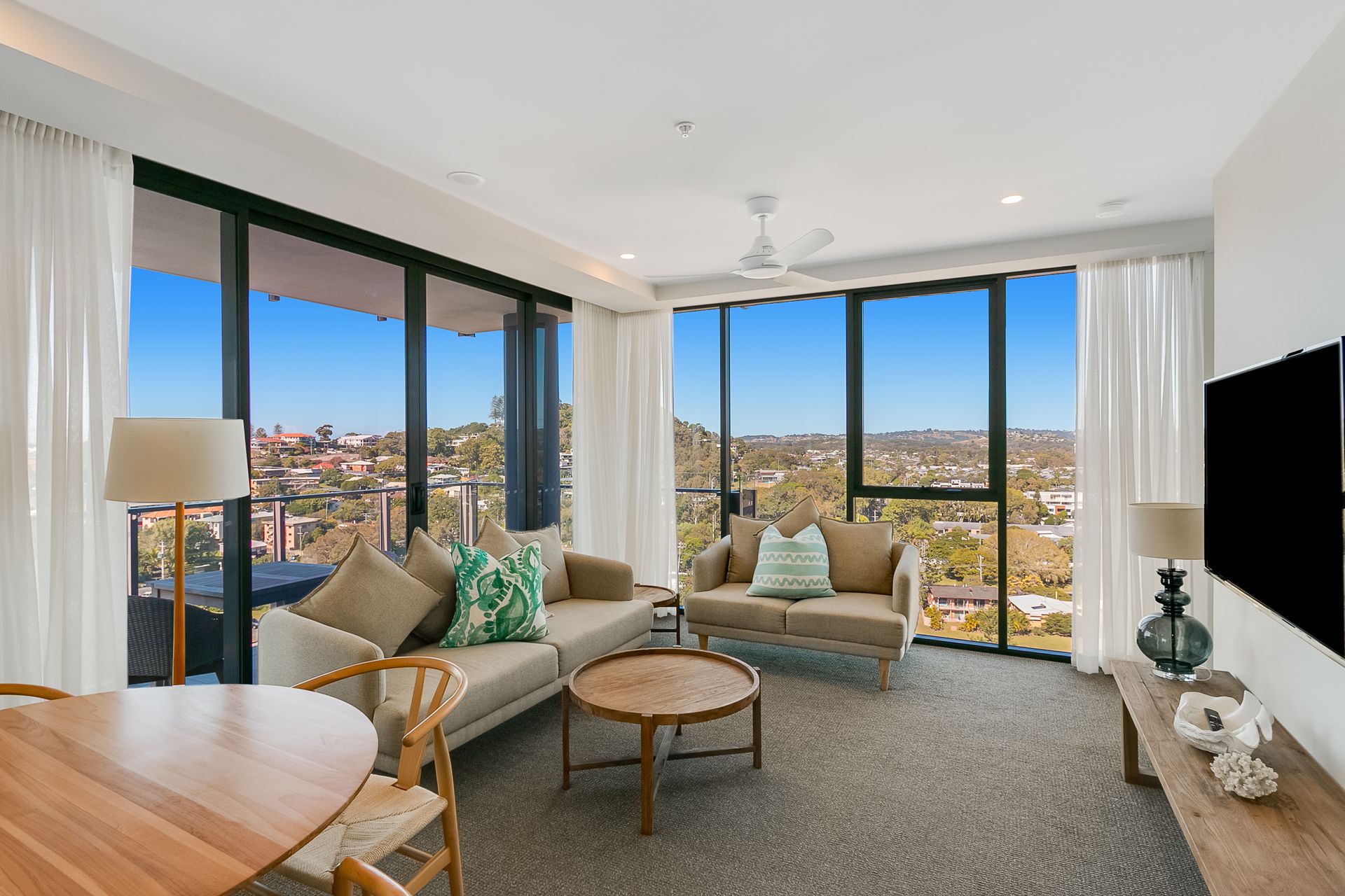 Located on the 13th floor, this two-bedroom apartment features a bright and stylish living area plus two balconies with ocean and hinterland views.